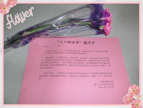 为庆祝第104个“三.八”国际劳动妇女节,hjc黄金城官方网站第12号党员工作站特举办 “喜迎3.8节,祝福送教师”主题活动。 3月7日,12号党员工作站的同学们为上课的女教师送上了鲜花和精心制作的慰问卡,向他们表达节日的美好祝福和深深的谢意,感谢老师们的教诲和奉献。一张祝福满溢的卡片,一只香气四溢的鲜花,一声节日快乐的祝福语,看似微不足道却无不彰显出同学们对老师的感恩之情,使整个校园到处洋溢着温馨的气氛。