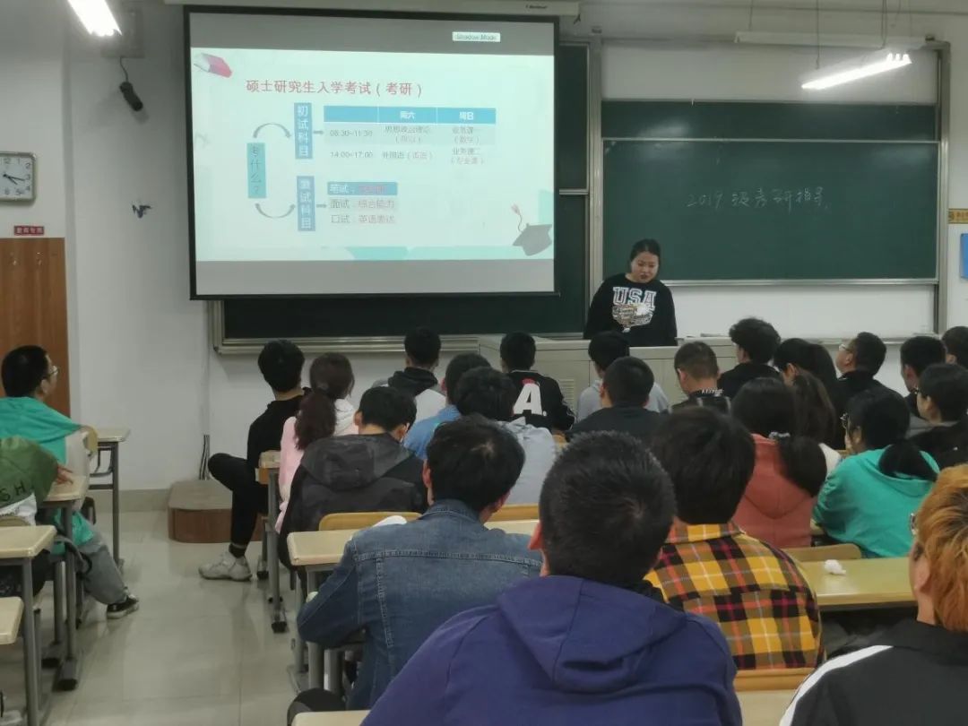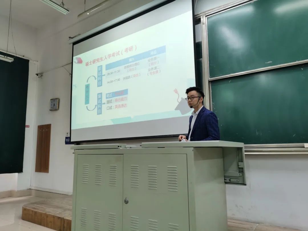三位老师分别介绍了学院往届毕业生就业与考研的情况。梳理了毕业生就业行业、岗位情况,讲解了一些公司对毕业生的基本要求,以及毕业生就业城市分布、薪资待遇等情况,让同学们对未来的方向有一定的了解。并重点对考研作了指导建议:介绍了考研考什么、各科目题型、分值、参考书目大纲、考研时间线,学校毕业条件基本要求等情况,并梳理了2015年至2021年全国研究生招生报考人数、录取人数和录取率,对学院往届毕业生考研院校、专业和考研率情况,进行解读和分析。并展示了往届考研优秀学子的复习计划,根据考研初试、复试的各科目情况,分别给出了详细的复习建议。最后对所有学生提出了六点希望:一是要科学制定目标,二是多方获取信息,三是尽早准备复习,四是做好复习计划,五是学会自我调节,六是坚持不懈努力。