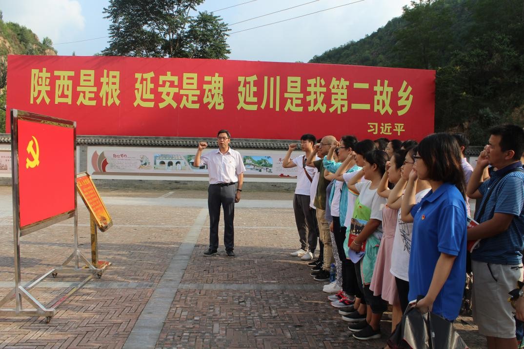 在梁家河村村委会前,举行了重温入党誓词活动,全体党员面对鲜红的党旗庄严宣誓,举起右手,朗声重温入党誓词,庄严向党承诺。