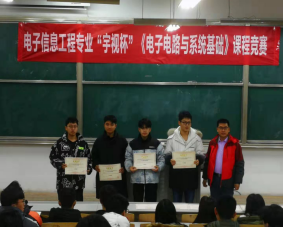 2021年1月6日,在教学楼B122举行了“宇视杯”《电子电路与系统基础》课程竞赛颁奖仪式。hjc黄金城官方网站副院长邓军勇、《电子电路与系统基础》课程教学团队全体成员以及电子信息工程专业2019级获奖团队参加颁奖仪式。