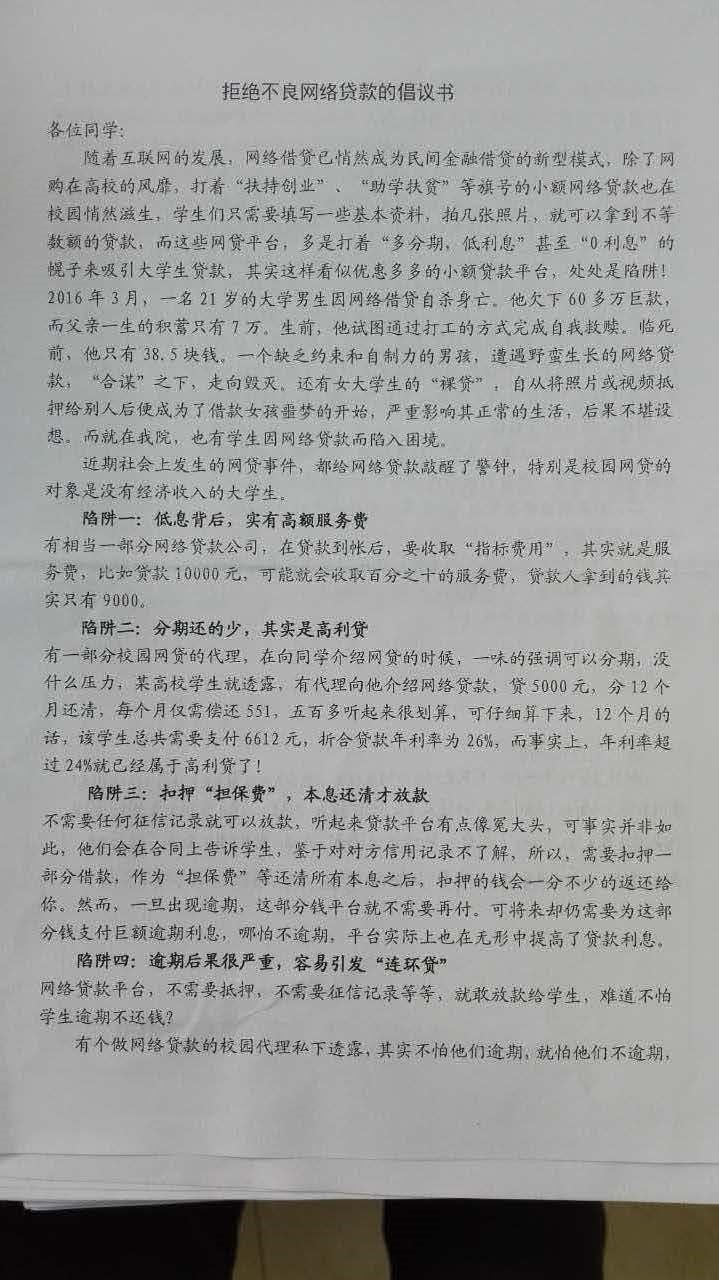 倡议书中列举了近期发生的典型校园借贷案例,分析了不良网络贷款的背后运作,揭示了不良网络贷款的陷阱和真相,用惨痛的案例警示大家远离不良网络贷款。同时提出倡议:以学业为重,不要铺张浪费;理性消费,拒绝攀比;如需贷款要和家长老师商量走正规渠道贷款。