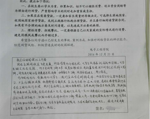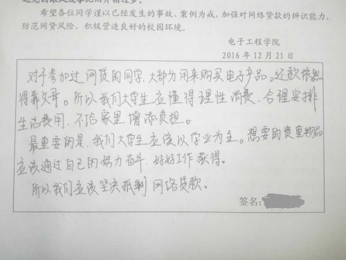 近年来网络贷款作为一种新型的借贷模式悄然侵入校园,直接影响校园的稳定和谐和学生的人身安全。大学生们普遍缺乏金融常识和防范观念,很容易掉进看似优惠多多的小额贷款平台的陷阱。尤其今年因校园借贷导致大学生自杀或者失踪案件频发,为了使学生们明白网贷的危害和背后的真相,提高学生的防范意识,近日向全院3300余名发起了“拒绝不良网络贷款”的倡议,每一位同学都收到了学院发放的《拒绝不良网络贷款的倡议书》,进行了认真地阅读和思考,同学们还在倡议书上写下了感言并郑重的签上了自己的名字。