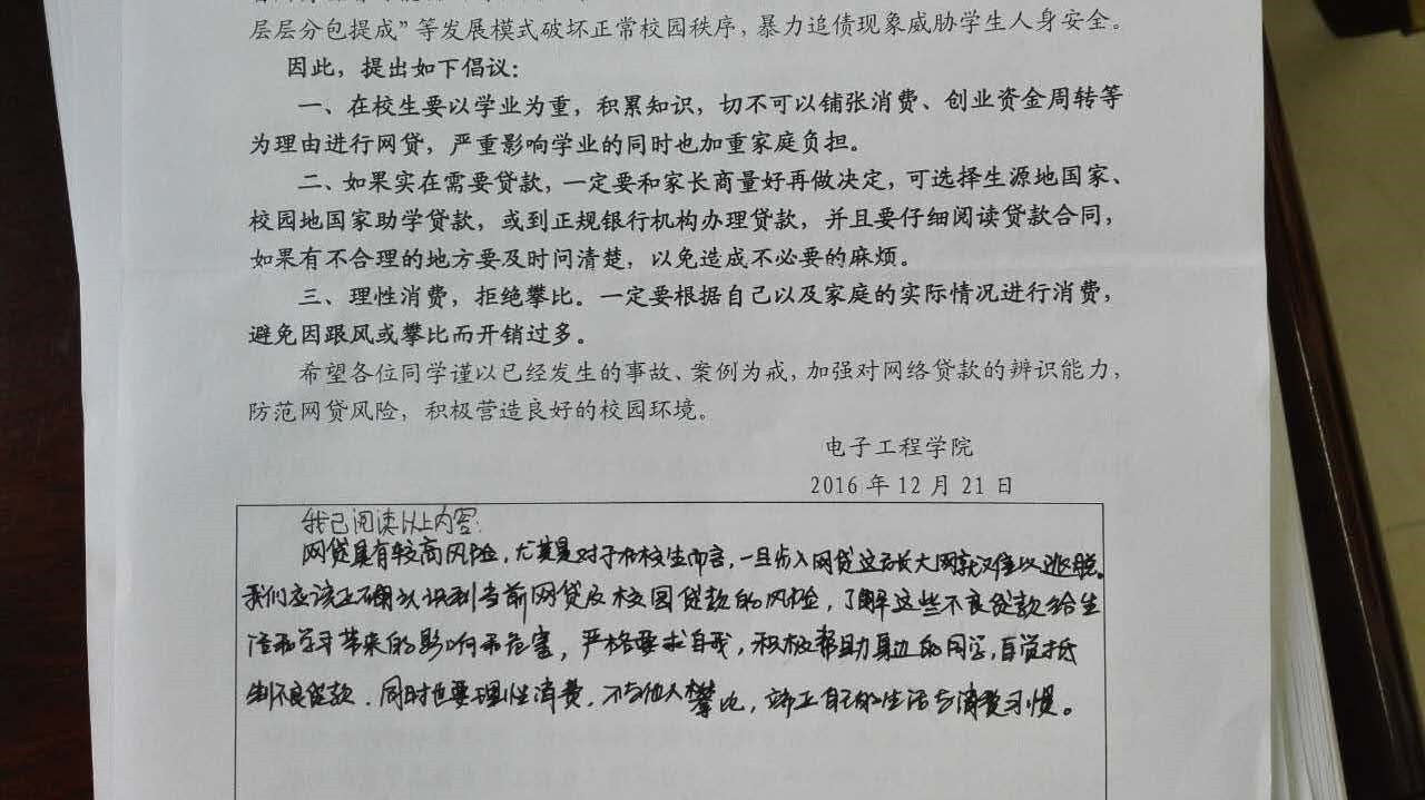 同学们看完倡议书后纷纷表示,一定会吸取教训,树立正确的消费观念,远离“高利贷”诱惑,以免影响学业,甚至危及人身安全。