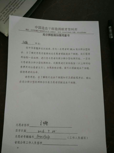 弓楠愣了一下,不过脑海里很快回想起来,在2007年的一天,她第一次在血库流动献血车前排队献血,采血过程中,血库工作人员让她填了一张登记表,并询问她可否做骨髓血型配对,成为一名造血干细胞捐献志愿者,同时告诉她配对成功的机率一般都很低,即使是在有血缘关系的人群中,相匹配的概率也只有万分之一,但如果配型捐献成功,对白血病、淋巴瘤和骨髓瘤等血液肿瘤患者来说,无异将获得第二次生命。