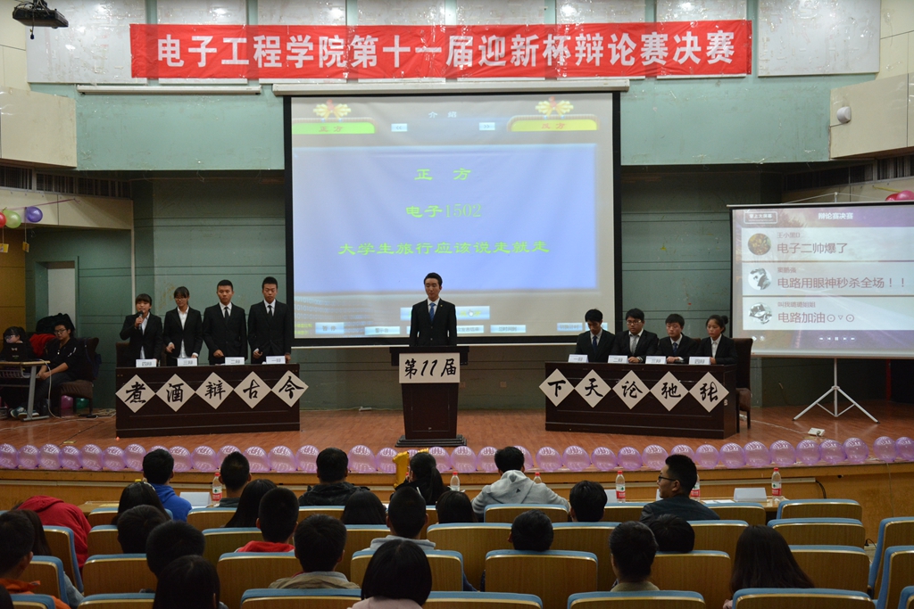 辩论赛上,各参赛队在没有硝烟的战场上奋力拼搏,最终电路1502、电子1502两支队伍脱颖而出,进行最后的对决。双方以“大学生旅行是否该说走就走”为题展开激烈辩论。正方电子1502班的辩手认为:大学是青春最后的旅程,要珍惜这剩余不多的青春,在旅行中学习课本上学不到的知识,留下弥足珍贵的人生体验。叙述精彩,赢得了在场观众的热烈掌声。但反方电路1502班也不甘示弱,以“大学生没有时间、经验,人生阅历无法应对突发情况,现阶段的主要任务依旧是学习”为论点反驳了正方观点,显得从容不迫。现场气氛热烈,双方辩手你来我往,唇枪舌战,精彩的发言不时引起阵阵掌声。最终电子1502班以360.2分赢得了本次辩论赛冠军。