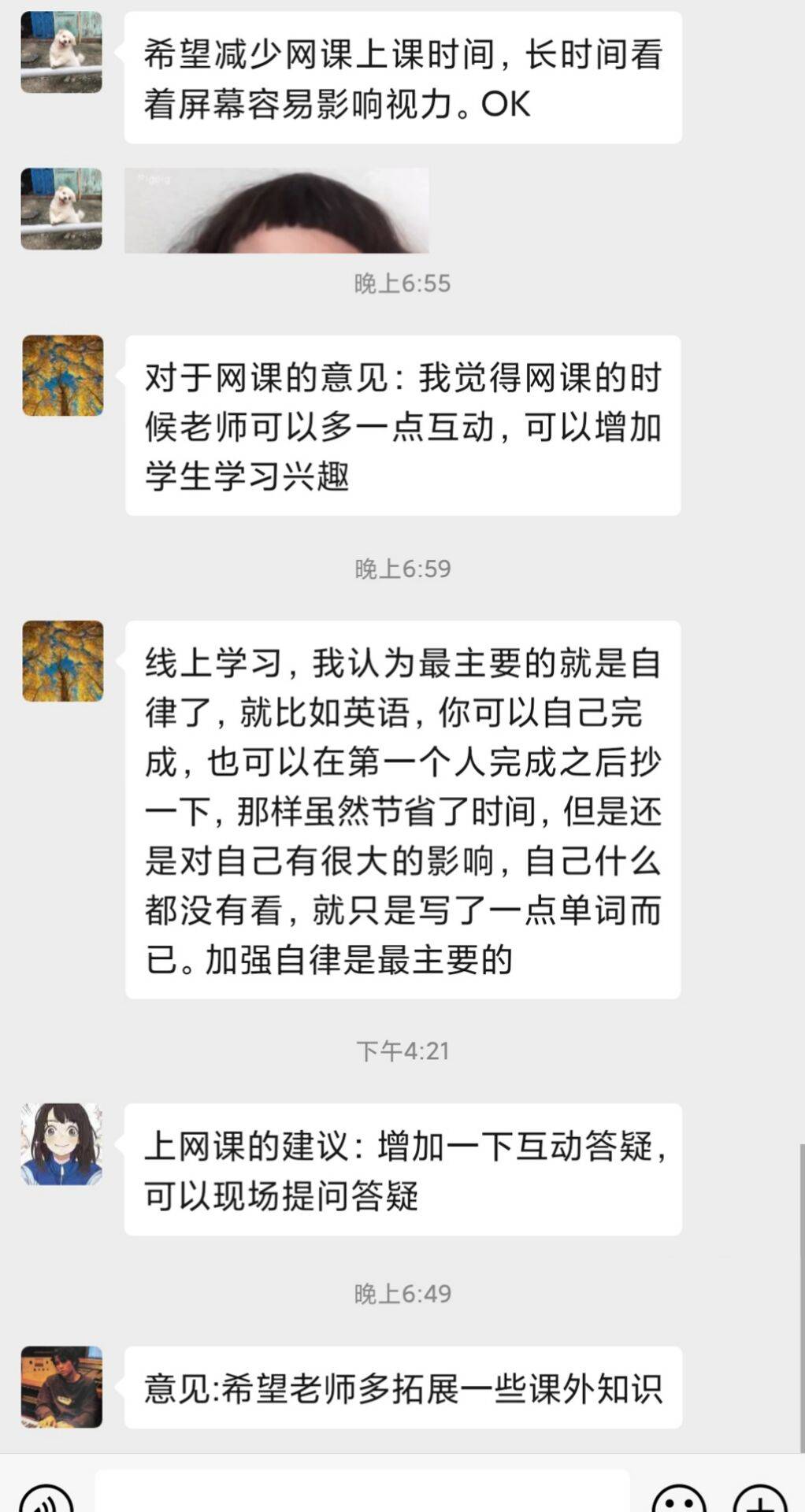 学生们普遍认为线上教学形式新颖,增强了同学们自主学习的能力,线上学习能够方便同学们复习巩固所学知识和内容,通过增加课堂提问吸引同学们的注意力,虽然不同的在线教学平台会带来了一定的不便,但大家都表示能够接受各种网络学习形式。科技1703班唐凯同学上完第一节课后认为:网课学习是一种非常方便的学习形式,线上学习形式新颖实用、更加灵活,老师在课前准备得非常充足,通过更多的师生互动,易于对知识的理解和掌握,建议增加对重点部分的录播,以便于同学课后复习。
