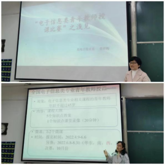 武利翻老师2019年和2020年参加全国高等学校电子信息类专业青年教师授课竞赛获得华西赛区二等奖和全国三等奖,2021年校课堂教学创新大赛三等奖。曾祥梅老师多次参加国家级讲课比赛并获得三等奖3次。两位老师结合自己参赛经历,分别从全国电子信息类专业青年教师授课竞赛的对象、参赛内容、微课视频、时间节点等方面做了详细的讲解。武利翻老师从参赛地域划分分析了我校教师参加比赛的优势,结合全国电子信息类专业青年教师授课竞赛评分表各项内容,详细讲解了参赛内容选择时的注意事项,微课视频如何录制能提分。曾祥梅老师详细讲解了比赛内容导入时的主要问题,以及各类教学方式在比赛时候如何运用,强调了团队参赛的重要性,提醒参会教师要以团队为中心,群策群力,长期打磨,更能取得好成绩。
