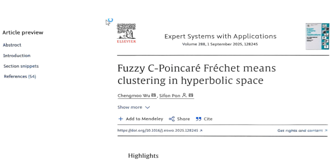 (通讯员 吴成茂)近日,hjc黄金城官方网站、集成电路学院23级电子科学与技术硕士研究生潘思凡在导师吴成茂高级工程师的指导下,发表了题为“Fuzzy C-Poincaré Fréchet means clustering in hyperbolic space”的研究成果。该论文首次提出了非平坦双曲空间的模糊C-庞加莱费雷歇均值聚类分析方法,推动了双曲几何学在非监督机器学习领域的应用发展。该成果建立了Zadeh模糊集理论、庞加莱球模型和费雷歇均值相结合的最优化聚类数学模型,并采用最优化方法和最小上界方法获得该最优化问题的交替迭代求解算法,同时对其收敛性进行数学证明,给其应用提供理论支撑。该论文相关研究结果将为模式分析与机器学习的研究提供了崭新的非欧几里得几何学思路。